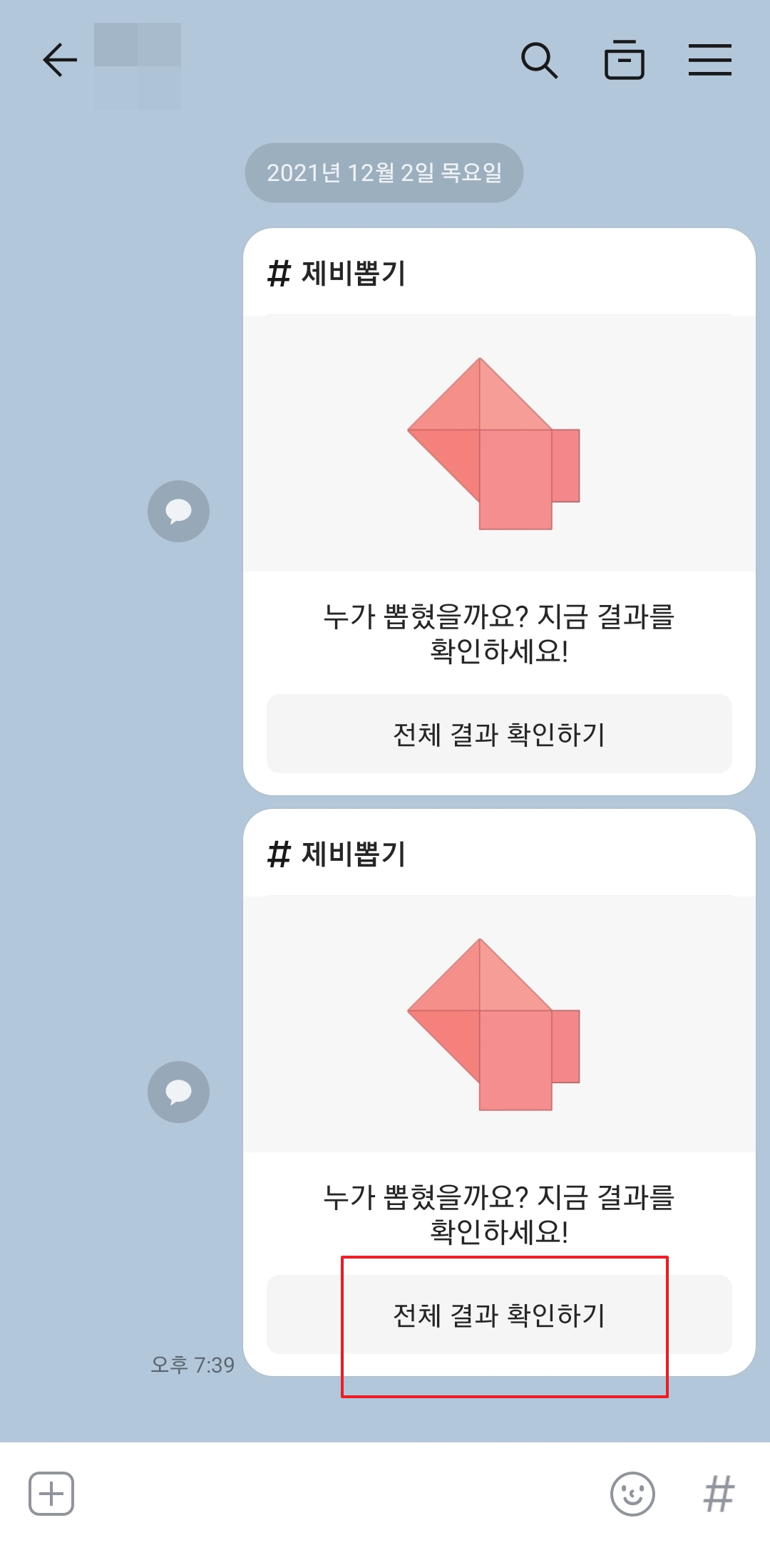 제비뽑기가 생성되면 채팅방에 위와 같은 메시지가 나타납니다. 모든 참여자는 '쪽지 확인하기'를 눌러 자신의 결과를 개별적으로 확인할 수 있습니다. 누가 꽝에 걸렸는지 바로 알 수 없어 두근거리는 재미가 있습니다.