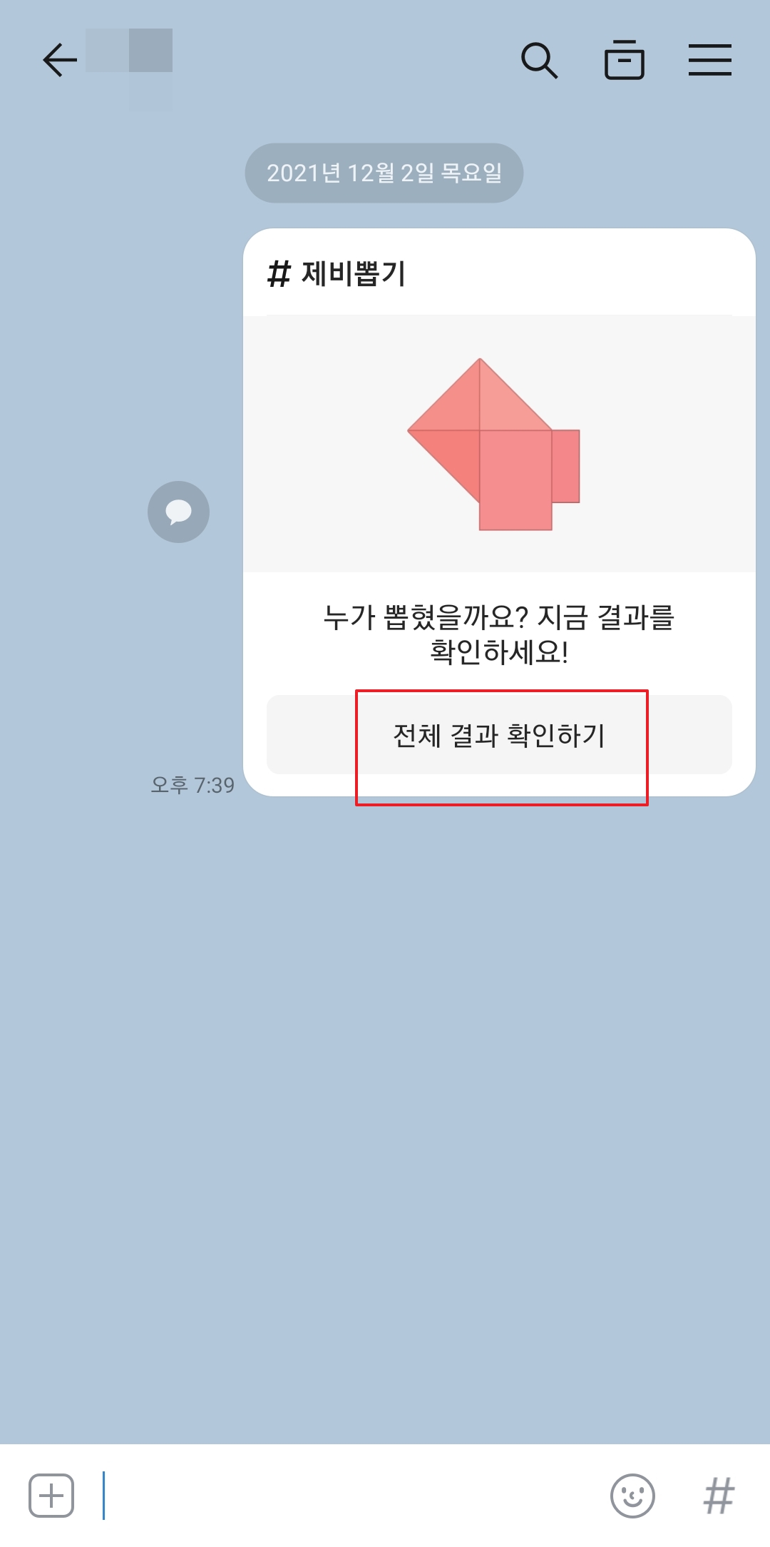카카오톡 제비뽑기 기능을 시작하는 첫 단계는 매우 간단합니다. 채팅을 입력하는 곳 바로 왼쪽에 있는 '#' 기호를 먼저 눌러주세요. 그러면 카카오톡 내의 다양한 추가 기능을 검색하고 실행할 수 있는 창이 활성화됩니다.