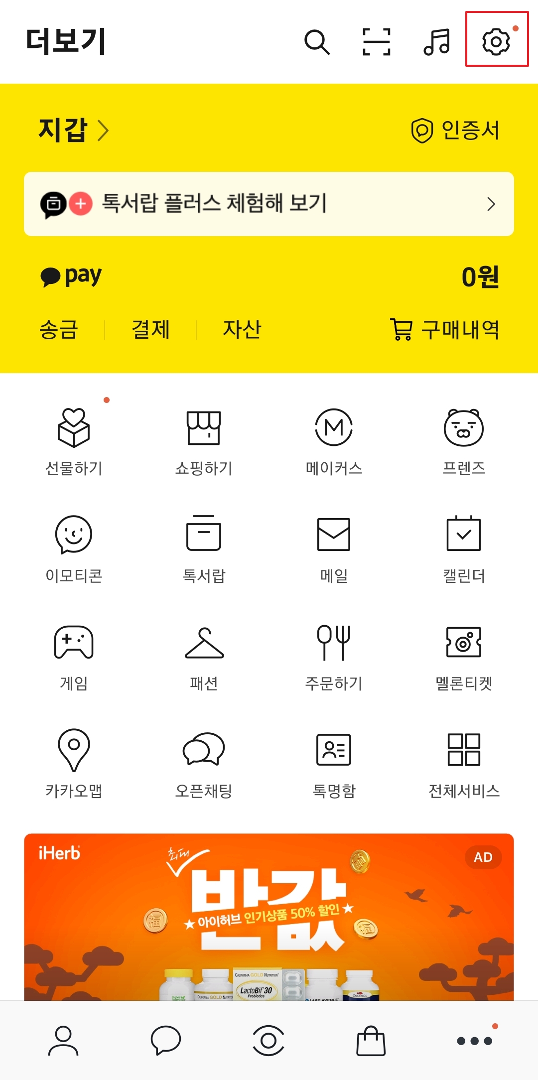 가장 먼저 카톡 알림음 소리가 안날때 확인해야 할 부분은 카카오톡 앱 자체 설정입니다. 카카오톡을 열고 오른쪽 아래의 '더보기' (점 세 개 아이콘)를 누른 후, 다시 오른쪽 위의 톱니바퀴 모양 '설정' 아이콘을 눌러주세요.