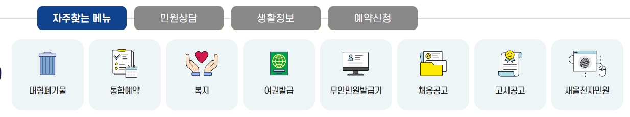 대형 폐기물 배출 예약, 여권 발급, 무인민원발급기 위치 안내 등 생활 속 필요한 서비스들을 간편하게 예약·확인할 수 있어요. 주민 입장에서 꼭 필요한 서비스가 정리되어 있다는 점이 큰 장점입니다.