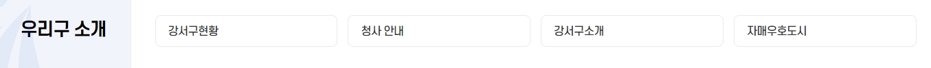청사 안내, 자매우호도시, 강서구의 역사 및 현황 등을 정리한 공간입니다. 외부 방문객이나 신규 전입자들에게 유용한 정보들이 많아요.