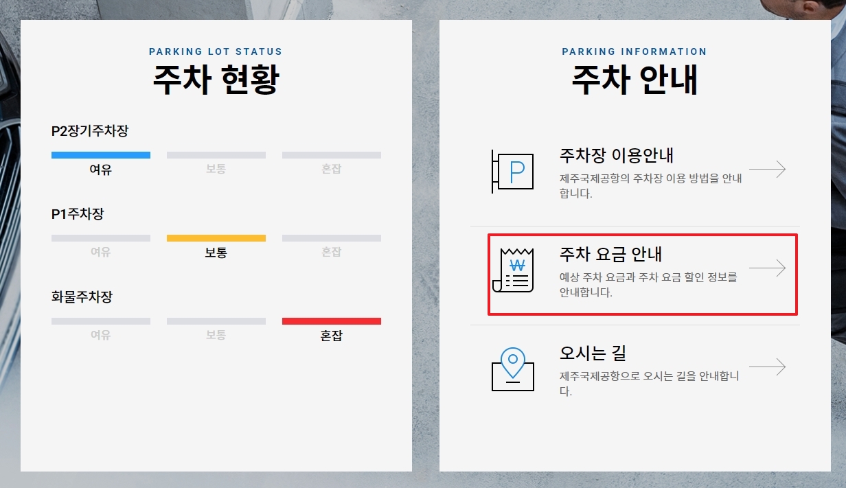공항 웹사이트 메인 화면에서 '교통/주차' 메뉴를 찾은 다음, 하위 메뉴로 나타나는 '주차안내'를 선택하면 됩니다. 그러면 주차장 위치, 실시간 주차 가능 대수, 그리고 가장 중요한 요금 정보를 확인할 수 있는 페이지로 이동하게 됩니다.