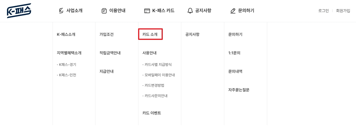 사이트 상단 메뉴에서 'K-패스카드' 항목을 누르면, 그 아래로 '카드소개'라는 하위 메뉴가 나타납니다. 이 메뉴를 선택하면 현재 발급받을 수 있는 모든 제휴 카드의 목록을 확인할 수 있어, 다양한 카드들을 한 곳에서 편리하게 비교해 볼 수 있습니다.