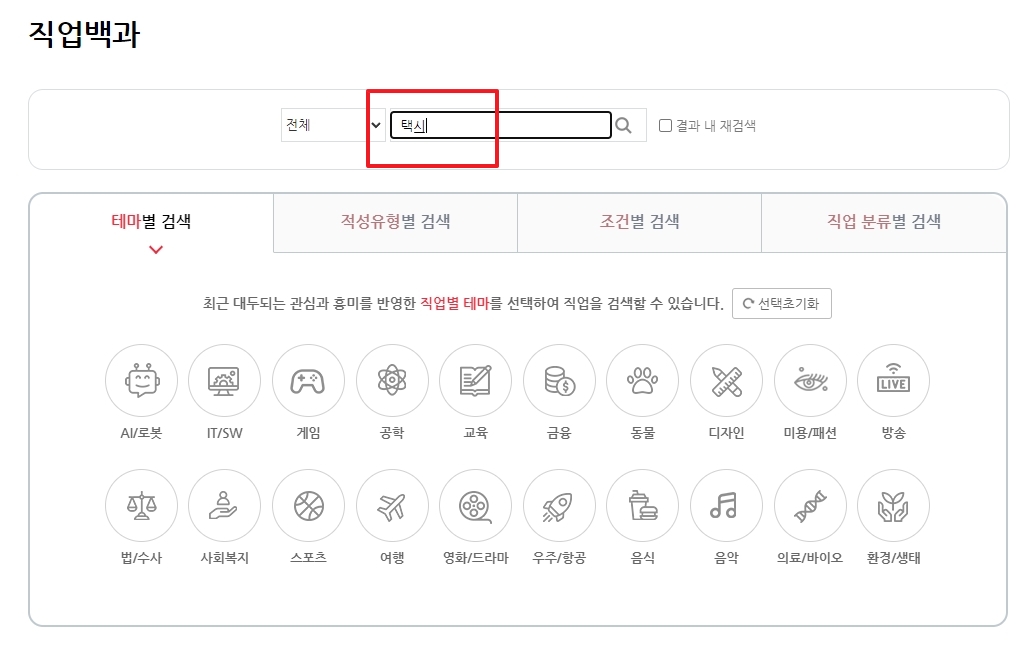 직업백과 페이지에 접속하면 편리한 검색 기능을 이용할 수 있습니다. 검색창에 '택시'라고 간단히 입력한 뒤 검색 버튼을 누르면, 관련 직업 목록이 나타나 손쉽게 정보를 찾을 수 있습니다.