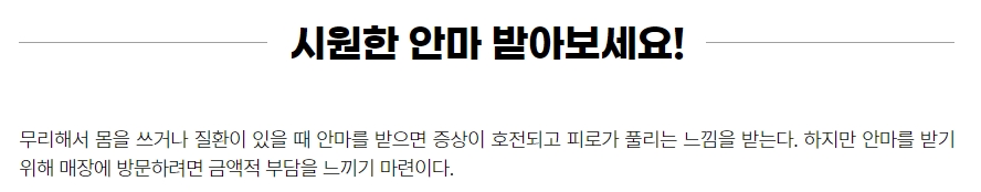 또한, 아무 곳에서나 서비스를 제공하는 것이 아니라 보건복지부의 인증을 받은 전문 안마센터에서 2년 이상 전문 교육을 이수한 안마사들이 서비스를 제공하기 때문에 믿고 몸을 맡길 수 있습니다.