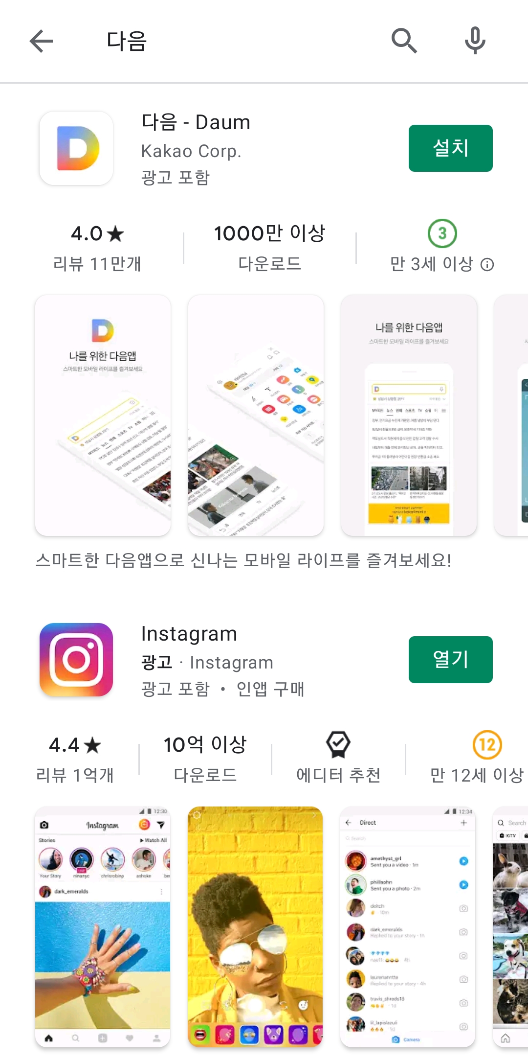 가장 먼저 스마트폰의 구글 플레이스토어나 애플 앱스토어에 접속해서 '다음' 앱을 설치해야 합니다. 인터넷 브라우저로 다음에 접속하는 것과는 다르며, 반드시 앱을 설치해야만 꽃검색 기능을 이용할 수 있으니 잊지 마세요.