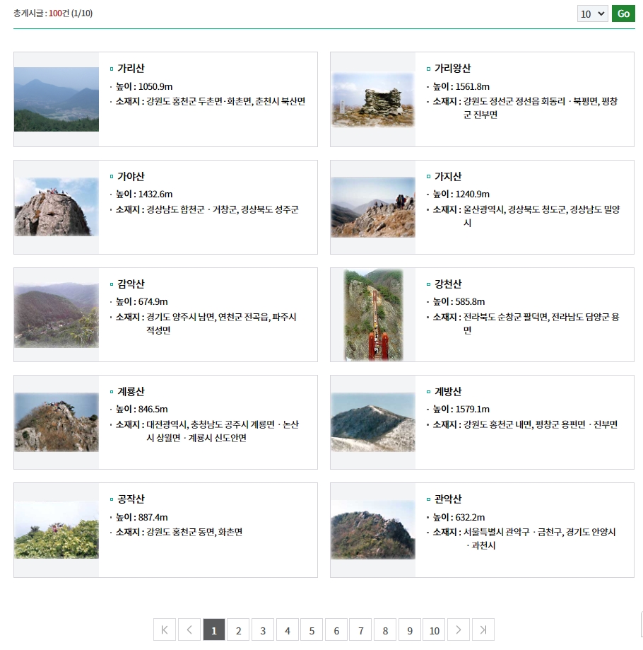 목록에서는 가리산, 가야산처럼 각 산의 이름과 높이, 위치 정보를 상세하게 안내하고 있습니다. 가리산은 강원도 춘천과 홍천에 걸쳐 있으며 정상에서의 조망이 뛰어나고, 가야산은 국립공원으로 지정될 만큼 수려한 경관을 자랑합니다.