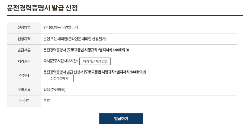 모든 내용을 확인한 후, 오른쪽에 보이는 '발급하기' 버튼을 눌러 본격적인 신청 절차를 시작합니다. 온라인 신청은 대리인이 절대 불가하므로, 반드시 운전자 본인이 직접 신청해야 합니다.