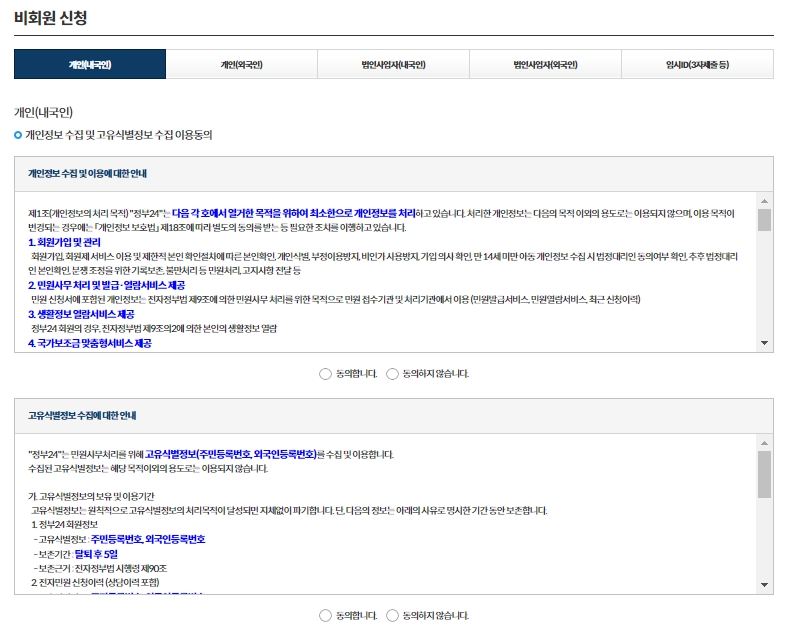회원이 아니더라도 간편하게 비회원으로 신청할 수 있습니다. '비회원 신청하기'를 선택한 뒤, 개인정보 수집 및 이용 동의와 같은 필수 약관에 동의하는 절차를 거칩니다.