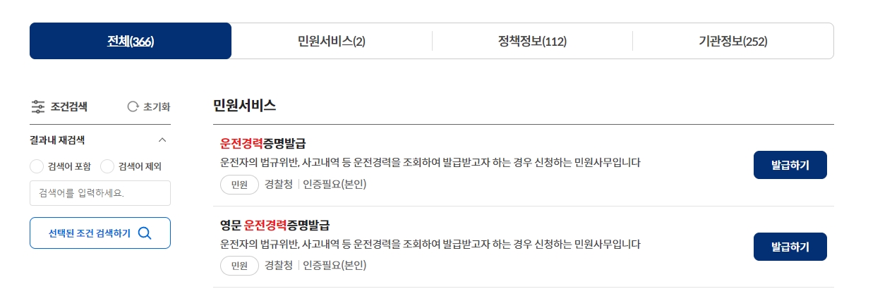 검색창에 '운전경력증명'이라고 입력한 뒤 검색 버튼을 누르면, 관련된 여러 서비스 목록이 나타납니다. 여기서 '운전경력증명서 발급' 항목을 선택하여 다음 단계로 넘어가면 됩니다.