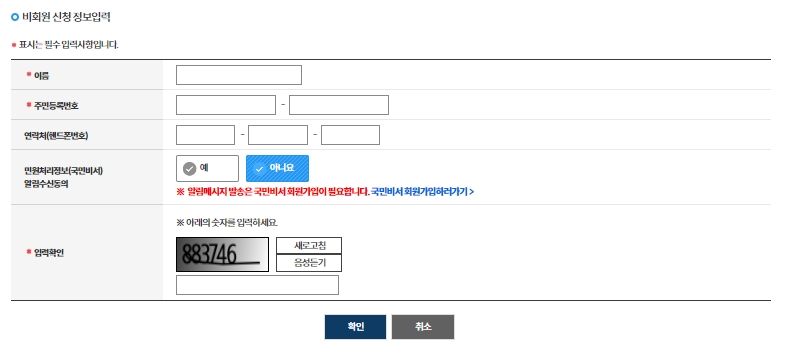 비회원 신청을 선택하면 이름과 주민등록번호, 연락처 등 개인 정보를 입력하는 화면이 나타납니다. 모든 필수 정보를 정확하게 기입한 후, 약관에 동의하고 다음 단계로 넘어가면 됩니다. 이 과정은 본인 확인을 위한 필수 절차입니다.