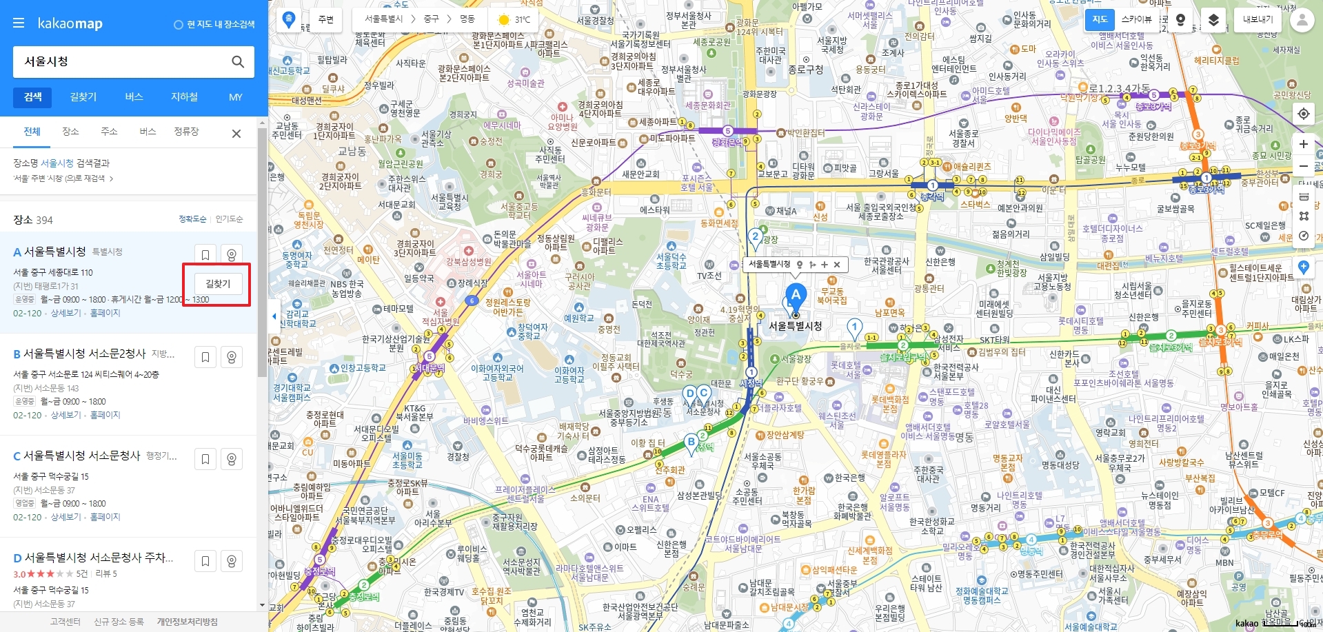 목적지를 선택하면 화면에 장소에 대한 간략한 정보가 나타납니다. 여기서 바로 '길찾기' 버튼을 눌러 출발지나 도착지로 설정할 수 있습니다. 아이콘 모양을 잘 보고 선택해 주세요.