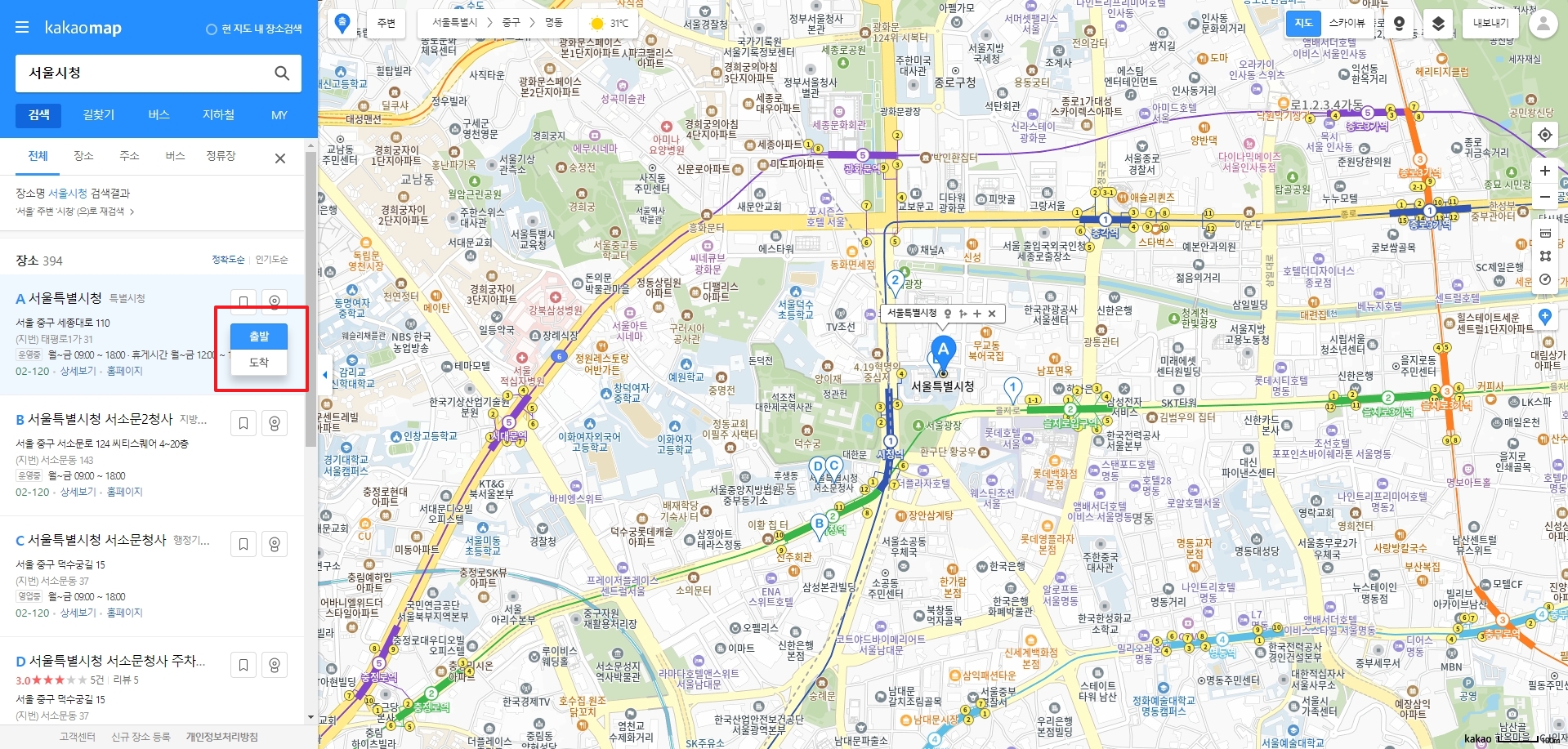 이제 출발지와 도착지를 모두 설정할 차례입니다. 방금 목적지를 설정했다면, 이제는 출발할 장소를 검색해서 '출발'로 지정해 주세요. 반대로 출발지를 먼저 정했다면, 도착지를 검색해서 지정하면 됩니다.