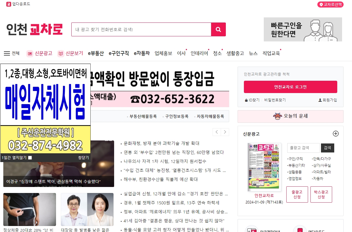 교차로 신문 홈페이지 메인 화면 접속 모습