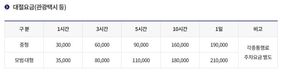 관광택시 등 대절 서비스를 이용할 경우, 중형은 시간당 30,000원, 모범·대형은 35,000원으로 책정되어 있습니다. 이 외의 통행료나 주차비 등은 별도입니다.