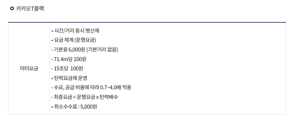 기본요금은 6,000원이고 기본거리는 없으며, 71.4m마다 100원, 15초마다 100원이 추가됩니다. 수요·공급에 따라 탄력적으로 요금이 조정됩니다.
