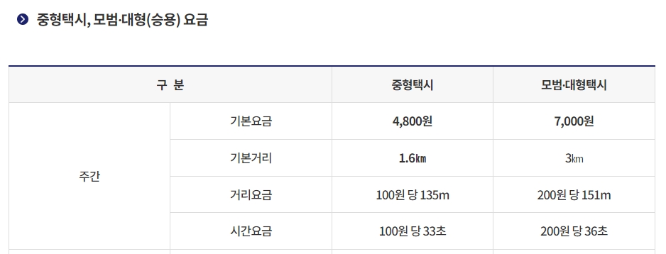 중형택시는 기본 1.6km까지 4,800원이 적용되며, 이후 135m마다 100원, 시간요금은 33초당 100원이 추가됩니다. 모범·대형택시는 기본 3km에 7,000원으로, 거리요금은 151m당 200원, 시간요금은 36초당 200원입니다.