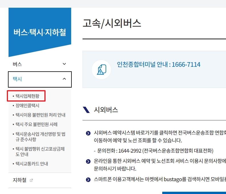 ‘택시’ 항목을 클릭하면 나오는 하위 메뉴에서 ‘택시업체현황’을 선택하면, 인천시 내 운행 중인 업체별 정보 및 요금 체계를 확인할 수 있습니다.
