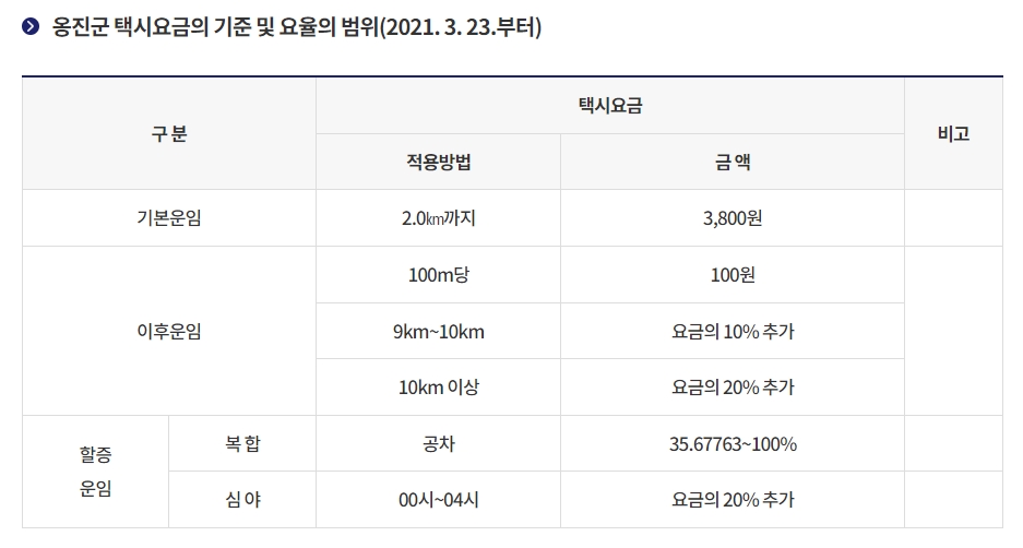 웅진군 외에도 지역별로 요금이 조금씩 다르며, 거리 및 시간에 따른 계산 방식이나 할증 기준은 각각 다르게 적용되기 때문에 지역별 안내문을 꼭 참고해야 합니다.
