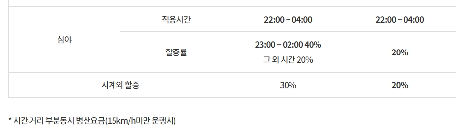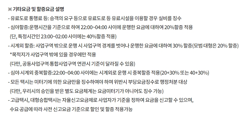 유료도로, 심야, 시계외 등 다양한 상황에 따른 추가요금이 존재하며, 시계외 이동 시 할증이 중복으로 적용될 수 있는 점을 주의하셔야 합니다.
