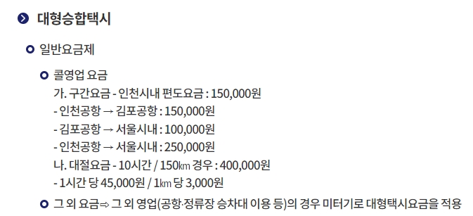 대형승합택시는 정해진 구간마다 요금이 설정되어 있고, 공항 간 이동 요금이나 대절요금도 별도로 안내되어 있습니다.