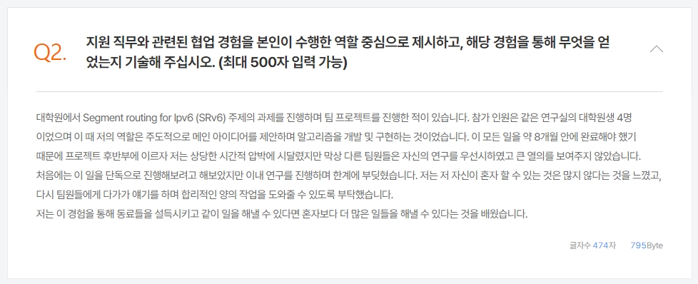 관심 있는 항목을 클릭하면 자소서의 전체 내용을 자세히 확인할 수 있습니다. 기업에서 제시한 질문과 그에 대한 합격자의 답변이 순서대로 정리되어 있어, 질문의 의도를 파악하고 어떤 식으로 답변을 구성해야 할지 배울 수 있습니다.