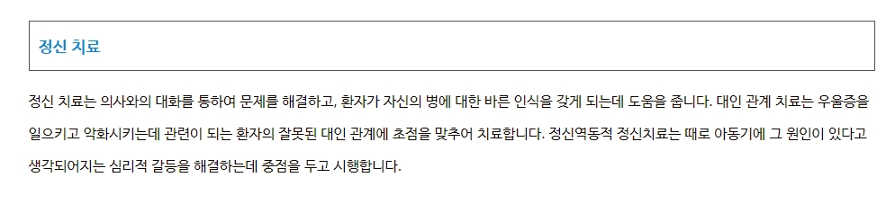 정신 치료 중에는 대인 관계 치료와 정신역동 치료가 많이 사용됩니다. 전자는 인간관계에서 생기는 스트레스를 줄이는 데 초점이 있고, 후자는 개인의 무의식적 갈등이나 과거 경험을 분석해 회복을 돕습니다.