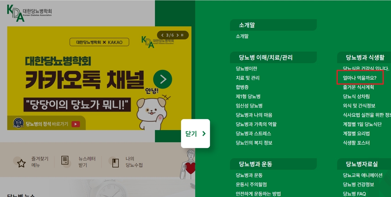 일반인 페이지로 이동한 후, 오른쪽 위에 위치한 메뉴 아이콘을 누르면 여러 가지 건강 정보 카테고리가 나타납니다. 여기서 우리는 '식사요법' 항목 아래에 있는 '얼마나 먹을까요?'를 선택해야 합니다.