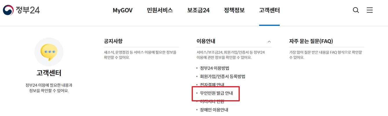 고객센터 메뉴는 이용에 어려움이 있거나 궁금한 점이 있을 때 도움을 받을 수 있는 곳으로, 우리가 찾고 있는 무인발급기 정보도 바로 이곳에 숨어있답니다. 어렵지 않으니 바로 다음 단계로 넘어가 볼까요?