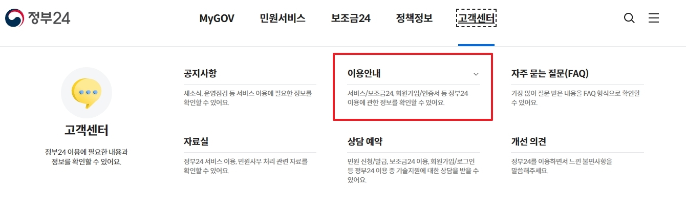 정부24 메인 화면에 들어오셨다면, 화면 위쪽에 있는 여러 메뉴 항목 중에서 '고객센터'라는 글자를 찾아 마우스로 클릭해주세요. 단순히 마우스를 위에 올려두기만 하면 하위 메뉴가 나타나지 않으니, 반드시 직접 클릭해야 다음 단계로 넘어갈 수 있습니다.