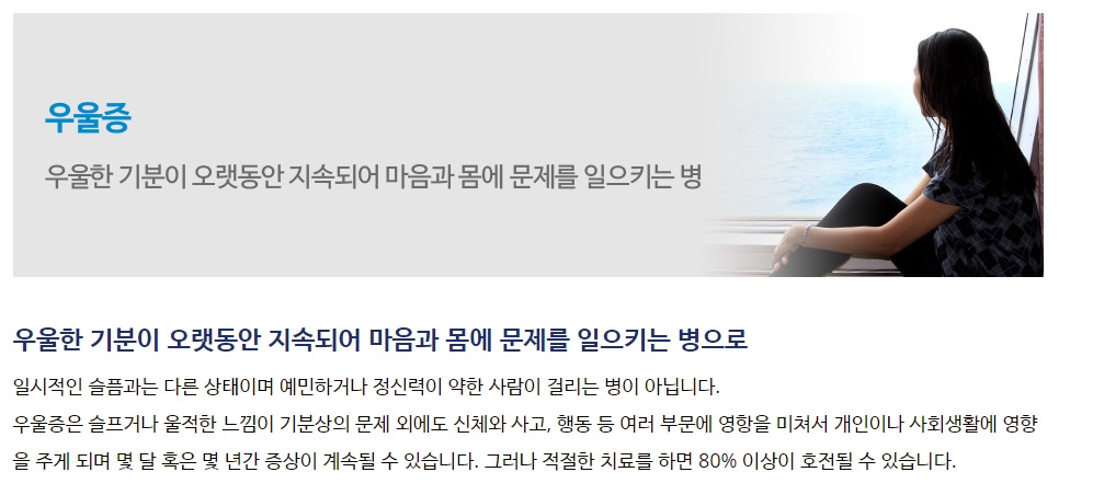 성인 클리닉 메뉴의 '우울증' 항목에서는 우울증의 정의부터 주요 증상, 세부 유형, 치료 방법까지 단계별로 정리돼 있어요. 특히 환자 본인뿐 아니라 가족이나 지인들도 이해하기 쉬운 구성으로 만들어져 있어요.