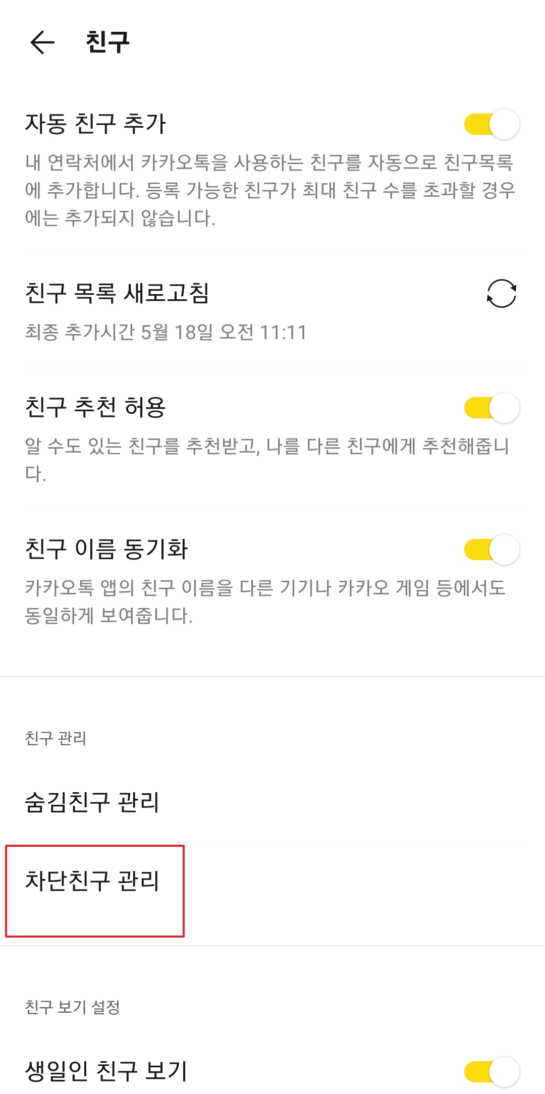 친구 메뉴로 들어가면 '차단친구 관리'라는 항목이 보일 거예요. 우리가 아까 차단했던 친구들이 모두 이곳에 모여있습니다. 이 '차단친구 관리'를 눌러서 다음 화면으로 이동합니다.