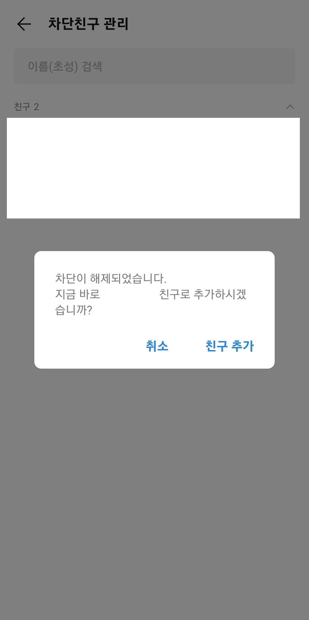 만약 여기서 '친구 추가'를 누르면 모든 것이 물거품이 되고, 그 친구는 다시 내 친구 목록으로 돌아가요. 친구 목록에서 완전히 삭제하려면 반드시 '취소' 버튼을 눌러야 합니다. '취소'를 선택하면, 차단은 해제되었지만 친구는 아닌 상태로 남아 목록에서 깨끗하게 사라집니다.