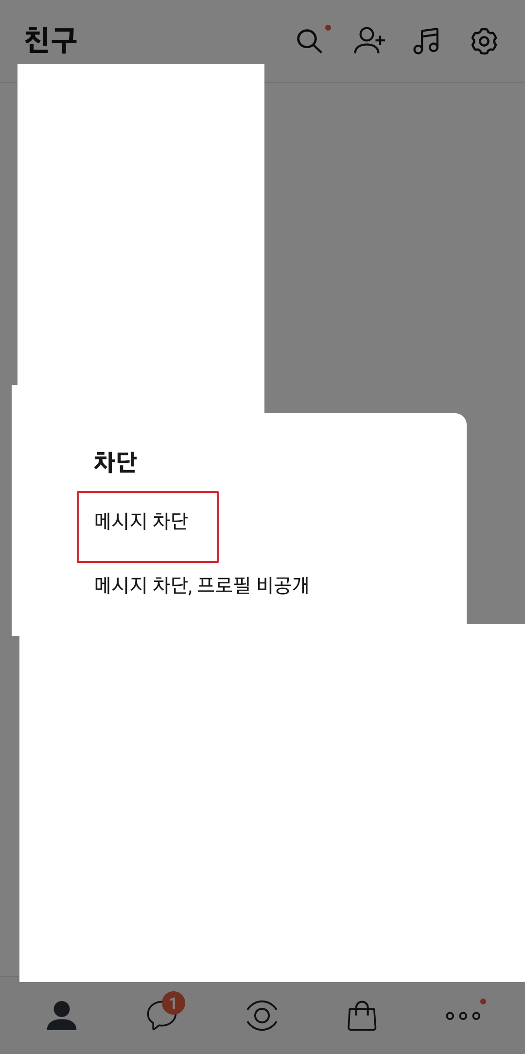 다음 화면에서 '메시지 차단' 또는 '메시지 차단, 프로필 비공개' 중 하나를 선택할 수 있어요. '메시지 차단'만 선택해도 친구 삭제는 가능하지만, 상대방이 내 프로필을 보는 것까지 원치 않으신다면 두 번째 항목을 선택하시는 것이 좋습니다.