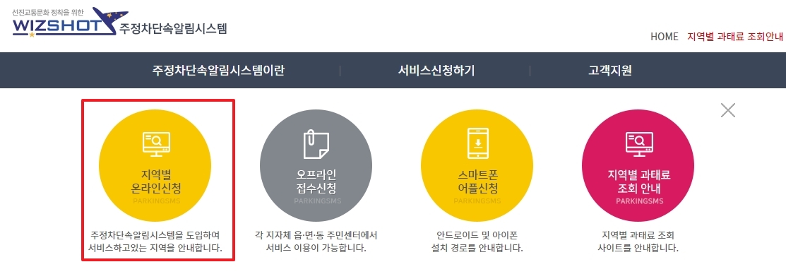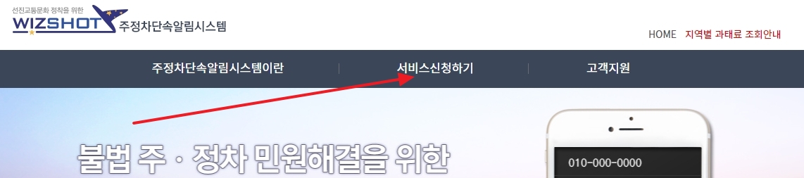 '주정차 단속 알림'을 검색하면 여러 통합 신청 화면을 만날 수 있어요. 그중 '위즈샷' 같은 곳은 주정차 단속 문자 알림 서비스를 제공하는 여러 지역을 모아 보여주어 편리하게 신청을 도와줍니다. 메인 화면에서 '서비스 신청하기'를 쉽게 찾을 수 있답니다.