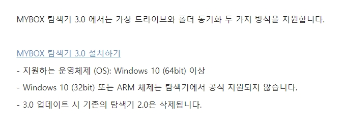 설치 파일을 실행하면 '마이박스 탐색기 3.0' 설치 안내창이 나타납니다. 탐색기 3.0은 이전 버전보다 속도와 안정성이 크게 좋아졌어요. PC 용량을 차지하지 않고도 모든 파일을 볼 수 있는 '가상 드라이브' 방식과, PC와 클라우드에 파일을 똑같이 저장하는 '폴더 동기화' 방식을 모두 지원해서 더욱 편리해졌습니다.