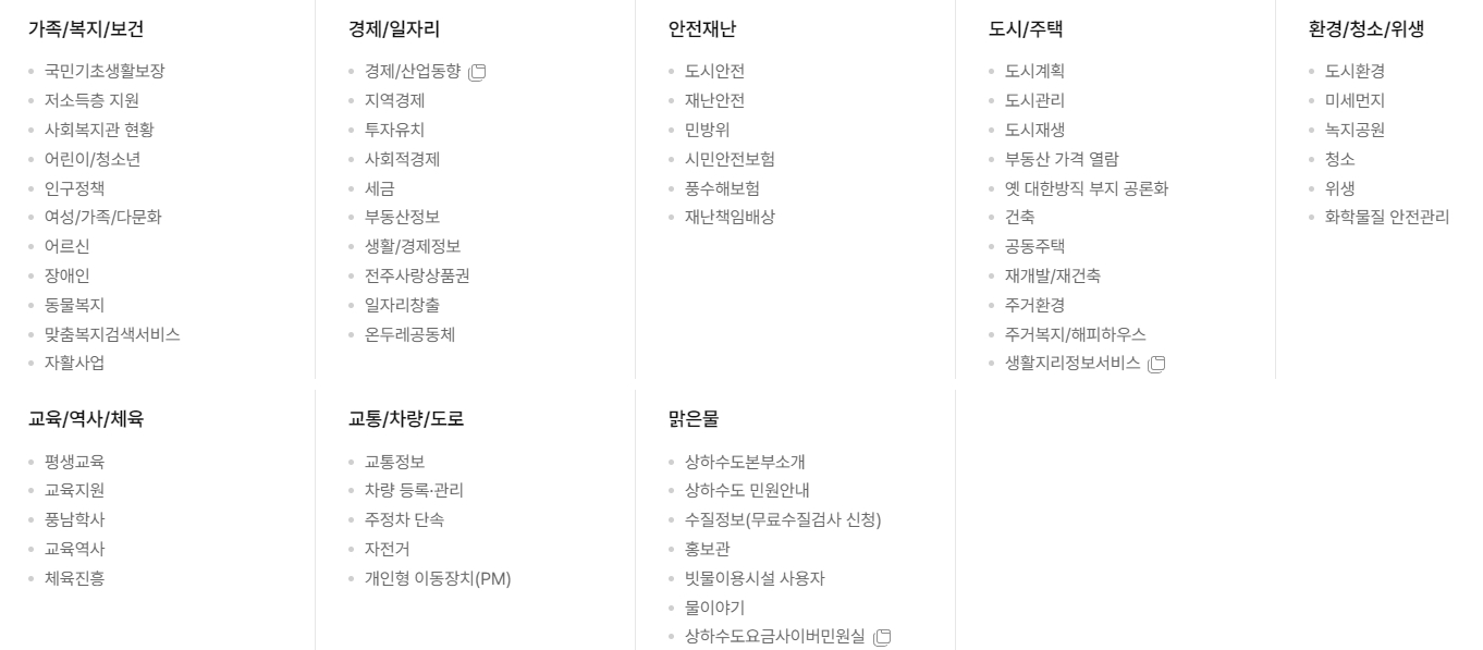 복지 서비스 영역에서는 아동·청년·노인·장애인 지원 정책과 복지시설 정보를 상세히 안내하며, ‘민원365’에선 민원 신청·조회·발급까지 한 화면에서 처리할 수 있어 별도 방문 없이도 행정 절차를 끝낼 수 있습니다.