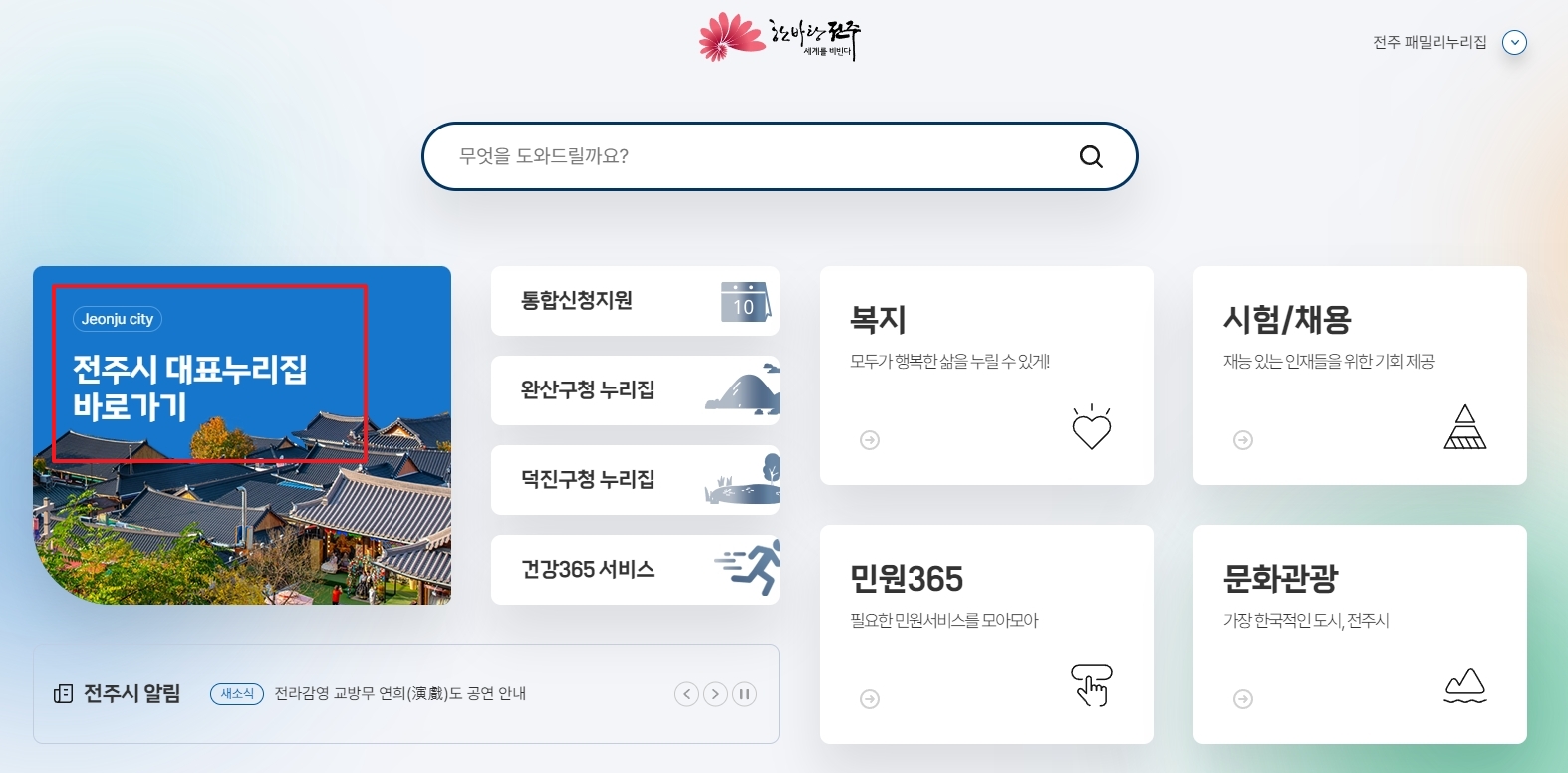 전주시청 홈페이지는 전자민원·복지지원·문화관광·일자리·시험 공고 등 시정 정보를 한눈에 볼 수 있는 전주 대표 행정 포털입니다. 메인 화면 ‘대표 누리집 바로가기’ 버튼을 누르면 통합신청지원과 완산·덕진구청 서비스, 알림마당, 시정 뉴스룸까지 순식간에 이동해 시민과 방문객 모두 필요한 정보를 빠르게 찾을 수 있습니다.