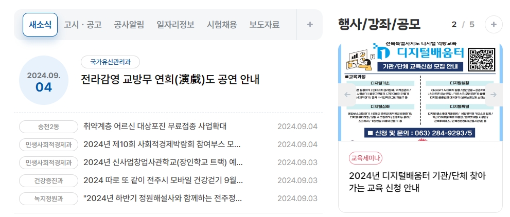 홈페이지 첫 화면의 ‘전주시 대표누리집 바로가기’ 메뉴를 클릭하면 전주 관련 주요 서비스가 모인 포털로 이동합니다. 이곳에서 행사 일정, 정책 안내, 생활 정보를 카테고리별로 쉽게 찾아볼 수 있어 처음 방문해도 길을 헤맬 필요가 없습니다.