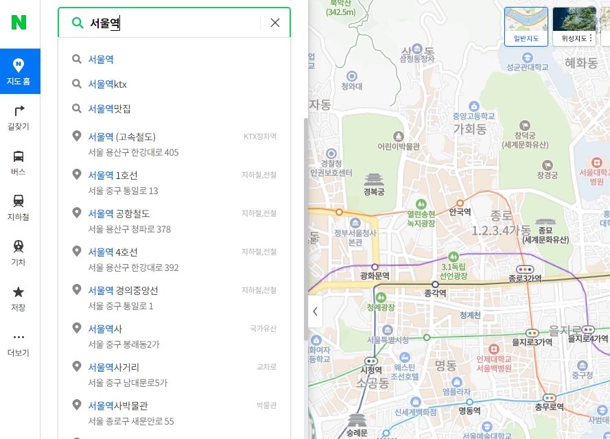 먼저 출발지를 정해야겠죠. 저는 예시로 '서울역'을 검색해서 출발 버튼을 눌러줬어요. 지금 계신 곳에서 바로 출발할 거면 '현위치'로 설정하시는 게 제일 편하고 정확할 거예요.