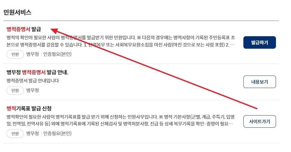 검색하면 '병적증명서 발급' 서비스가 바로 보일 거예요. 여기서 '발급' 버튼을 누르면 신청 화면으로 넘어가게 됩니다. 이 서비스는 병역 의무를 마쳤거나, 면제받은 사실을 증명해야 할 때 쓰는 거죠.