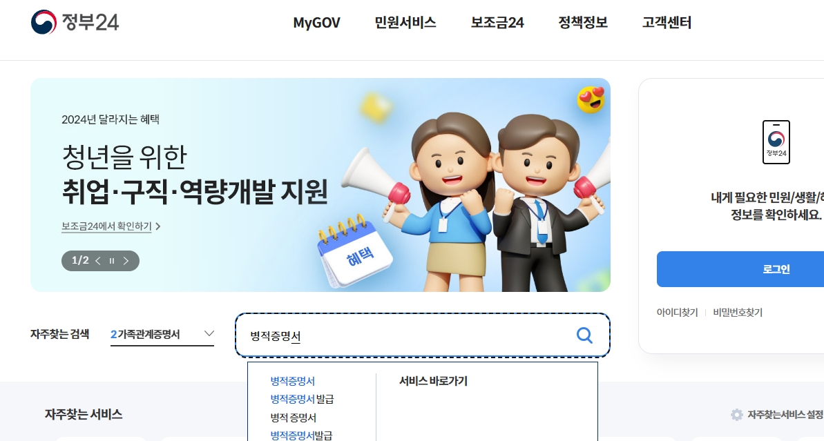 메인 화면에 보면 '검색창'이 크게 보일 거예요. 여기에 그냥 '병적증명서'라고 입력하고 검색 버튼만 누르면 관련 서비스로 바로 안내해 줍니다. 괜히 메뉴 찾느라 헤매실 필요 없어요.