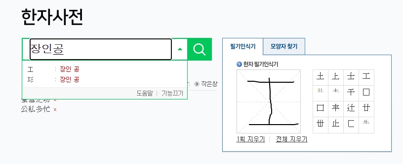 이게 바로 필기인식기 화면이에요. 제가 테스트로 '장인 공(工)' 자를 한번 그려봤거든요. 솔직히 마우스로 그린 거라 삐뚤빼뚤한데도 오른쪽에 '工' 자를 포함해서 비슷한 한자들을 꽤 정확하게 찾아주더라고요.