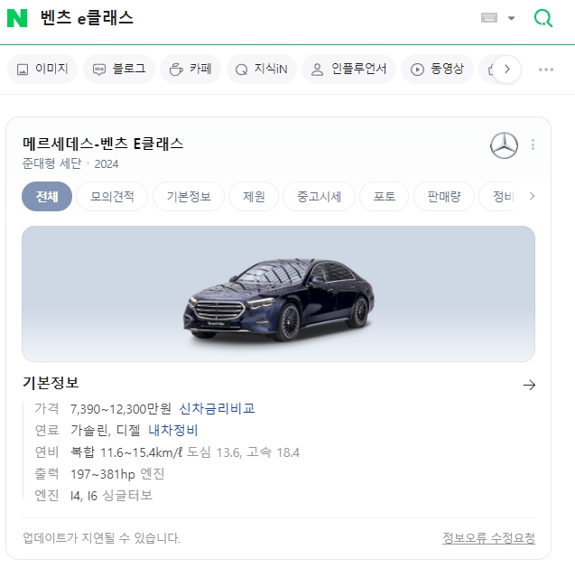 네이버 검색창에 '벤츠 E클래스'라고 검색하면 이렇게 바로 차량 정보가 떠요. 예전에는 이런 거 보려면 복잡하게 공식 홈페이지 들어가야 했는데, 요즘은 포털에서 바로 보여주니까 정말 편해졌죠. 벤츠 E300 가격을 알아보는 첫 단계라고 보시면 돼요.