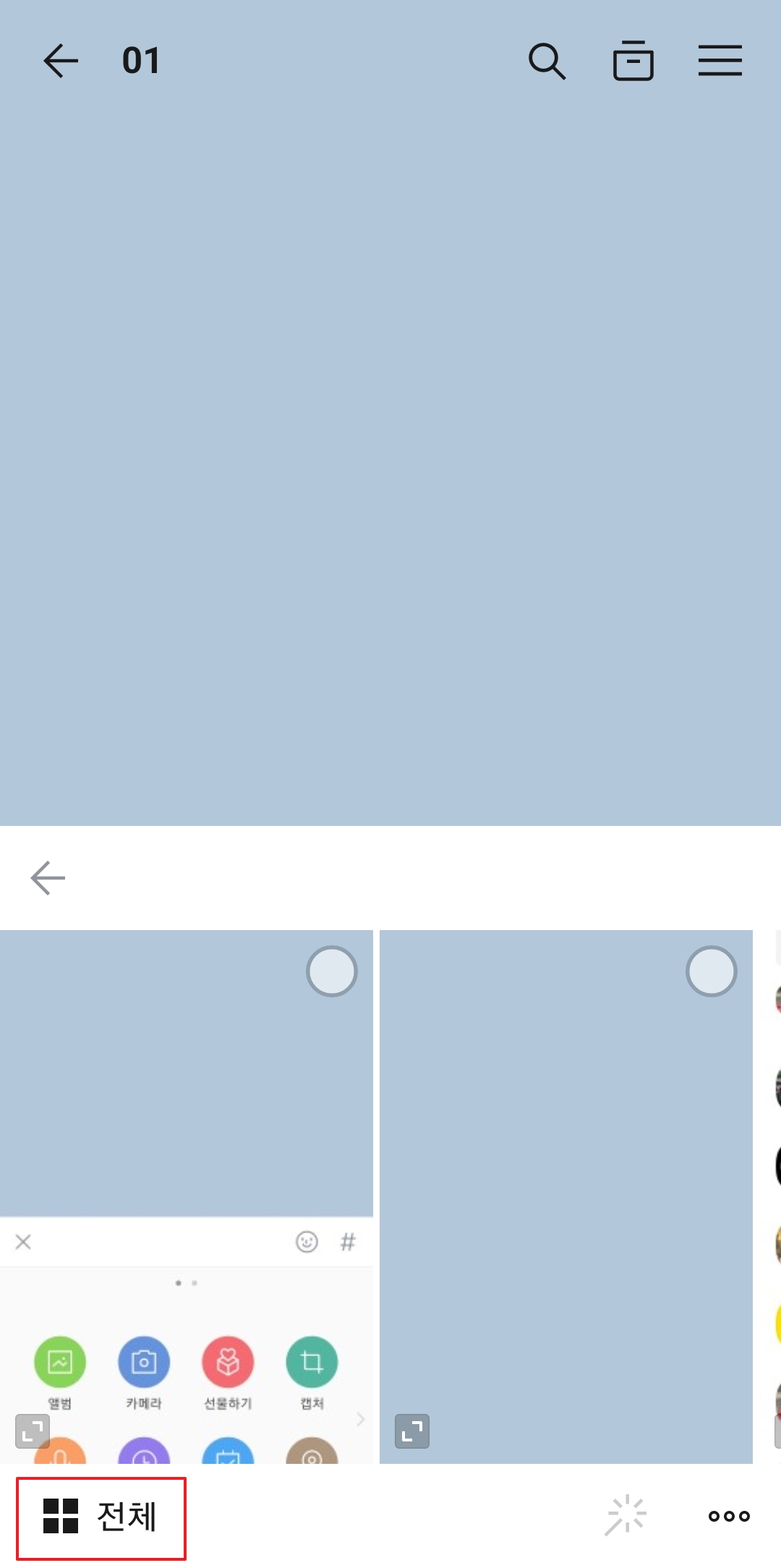좌측 하단 + 아이콘을 누르면 여러 가지 전송 옵션이 나오는데, 그 중에서 ‘앨범’을 선택해야 사진을 묶어 보내는 설정이 가능한 화면으로 진입할 수 있습니다.