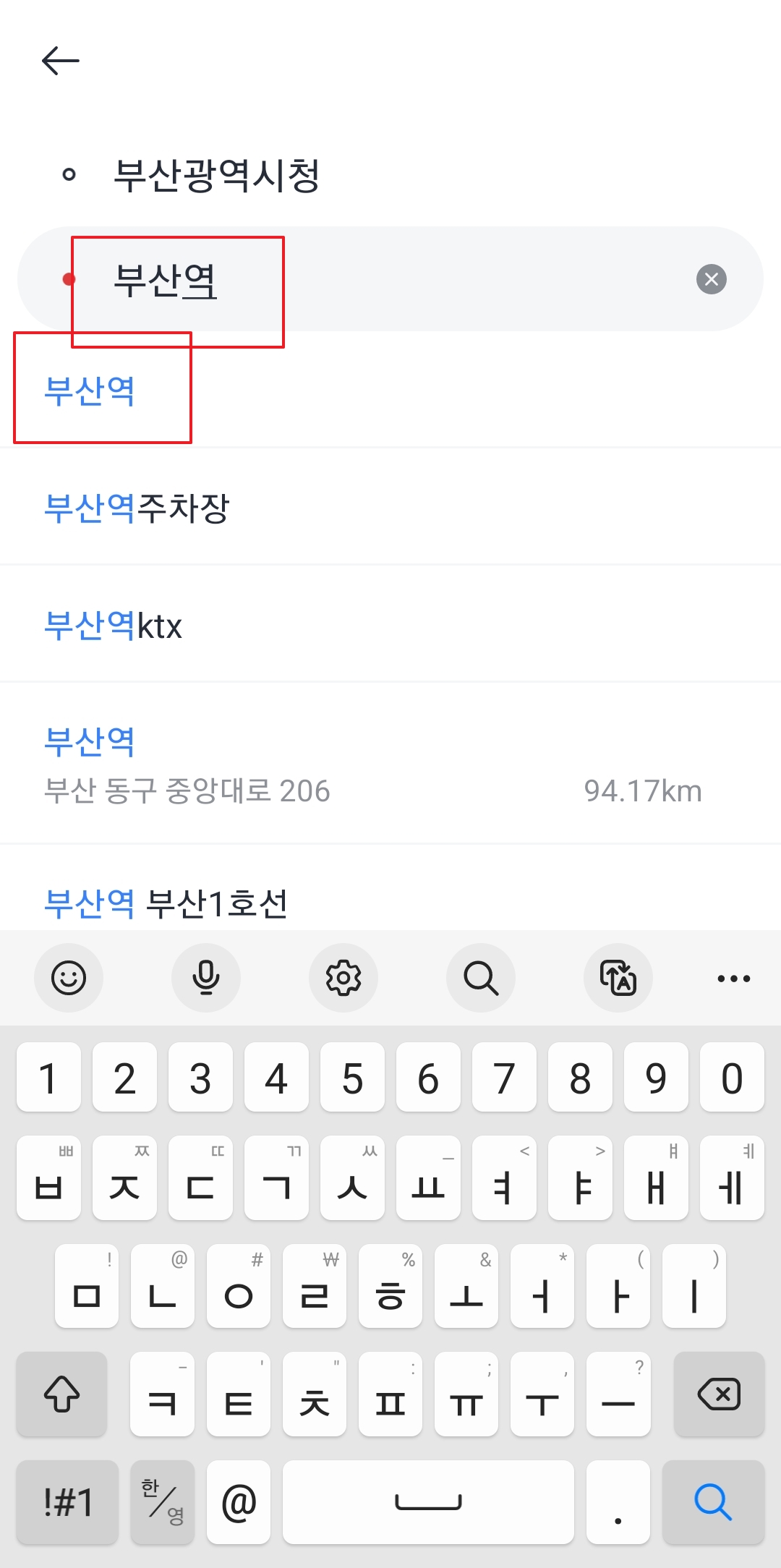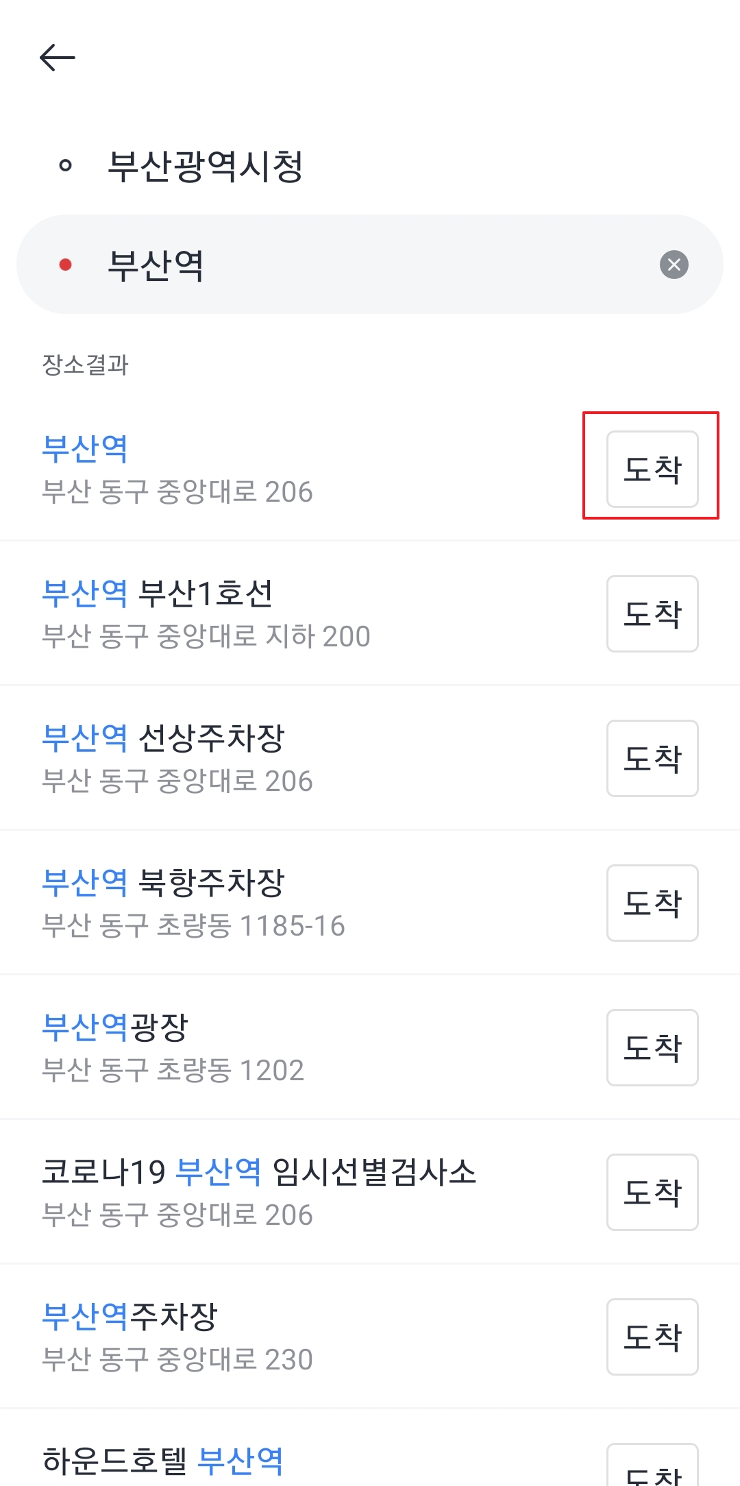 출발지를 정했으면 이제 '도착지'를 입력할 차례예요. '어디로 갈까요?'라고 쓰인 검색창을 눌러서 가고 싶은 곳의 이름이나 주소를 입력하시면 돼요. '부산역'처럼 유명한 장소는 이름만 쳐도 바로 나와요.