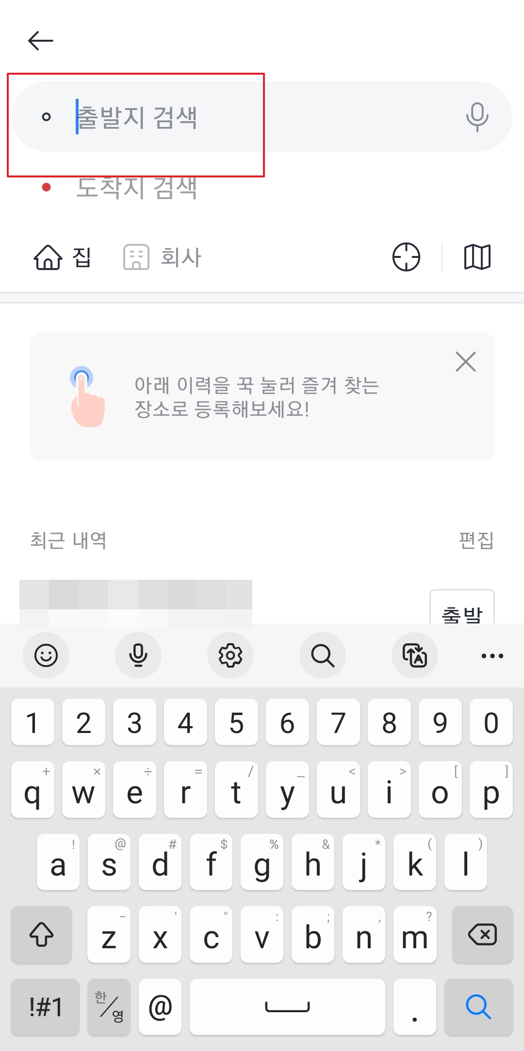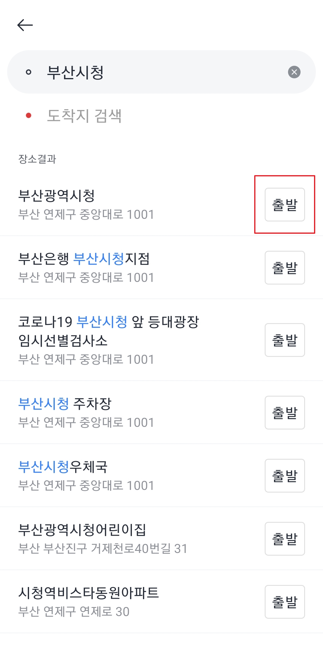 핀을 움직이는 게 불편하면, 출발지 주소가 써진 부분을 직접 눌러서 검색할 수도 있어요. 예를 들어 '부산시청'에서 출발할 거라면, 검색창에 '부산시청'이라고 입력하고 나오는 결과를 선택하면 되죠.