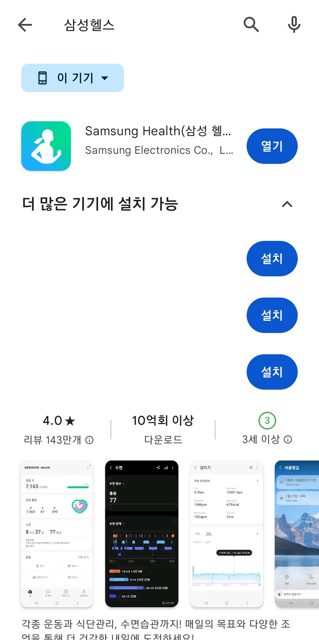 검색창에 '삼성 헬스'라고 입력하면 바로 최상단에 뜹니다. 비슷한 이름의 광고 앱들이 많으니 헷갈리지 마시고 꼭 삼성전자(Samsung Electronics)에서 만든 공식 앱인지를 확인하고 설치 버튼을 눌러주세요.