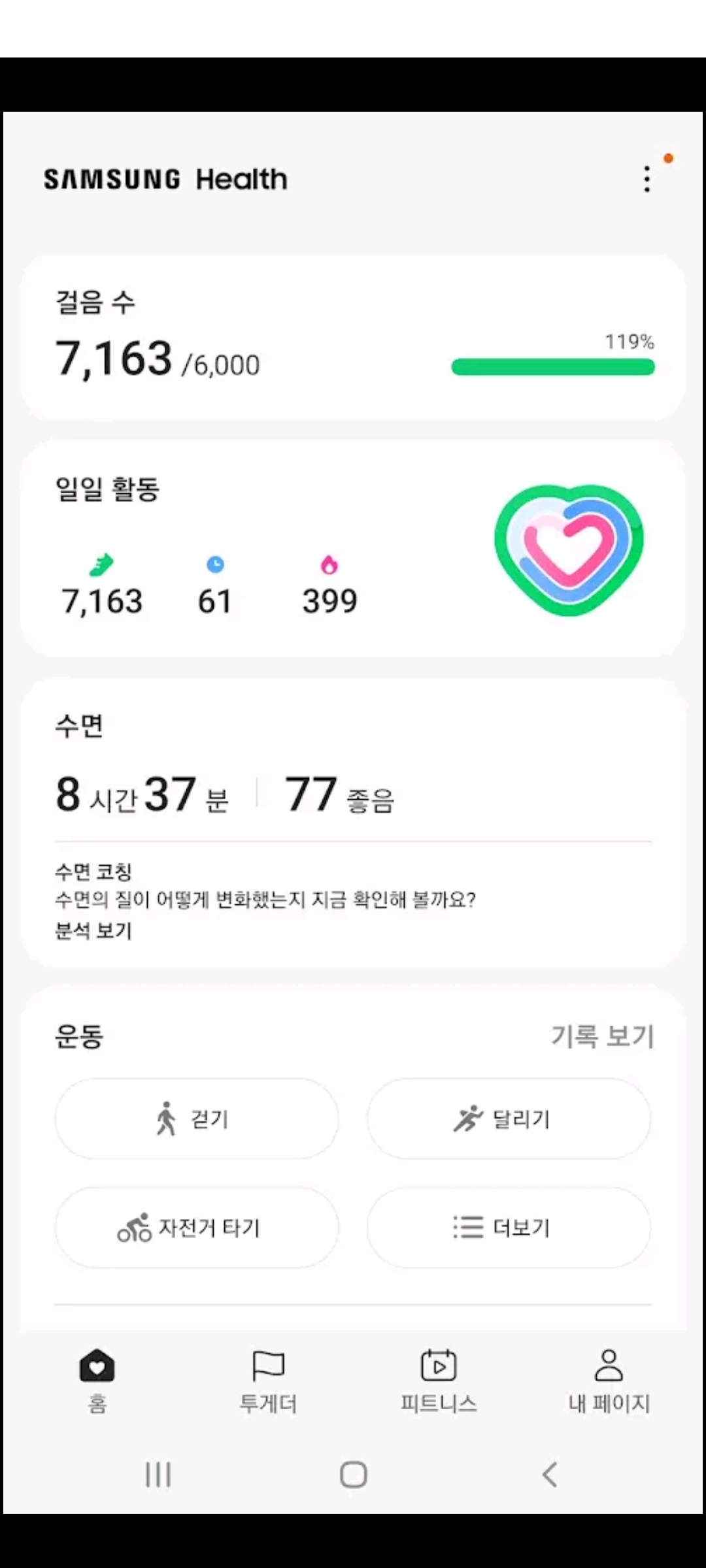 로그인을 마치고 나면 신체 활동에 대한 권한 허용 창이 뜰 거예요. 걸음 수를 측정하려면 센서 접근이 필요하니까 당황하지 마시고 허용해 주시면 됩니다. 기본적으로 메인 화면에서는 일일 걸음 수가 가장 크게 보이고, 목표 달성 여부도 그래프로 예쁘게 보여줘서 동기부여가 확실히 되더라고요.