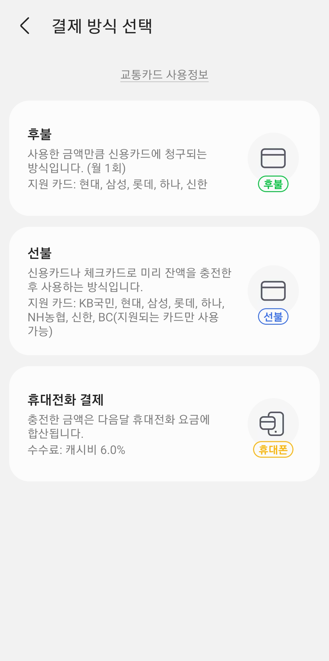 - 캐시비(Cashbee): 롯데, 현대, 삼성, 하나, 신한 등 지원 (국민카드 미지원 주의)